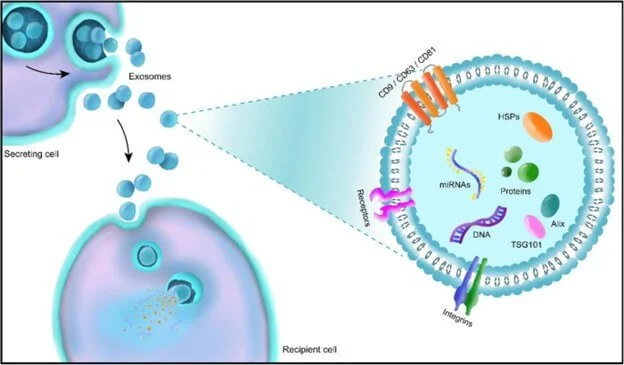 Exosomes are tiny, naturally-occurring vesicles that play a crucial role in cellular communication. These microscopic messengers are secreted by most types of cells in the body. Exosomes carry a payload of bioactive molecules, such as proteins, lipids, and growth factors, which enable them to transfer essential information between cells.⁴